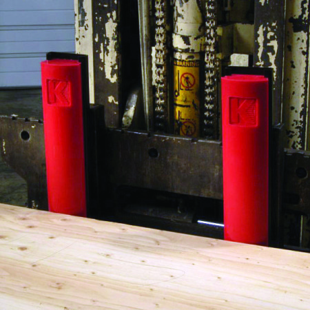 The Fork-Kushions offer a resilient yet durable solution by equipping a forklift truck with specially engineered polyurethane bumpers that are mounted to the upright of the fork. These highly engineered bumpers provide cushioning protection from marring, denting and other forms of damage. The unique structure offers excellent wear properties and vibration deadening without compromising the load capacity of the lift truck. Available for 4″, 5″ & 6″ wide forks; mounting bracket measures 24″ in length. Sold in sets including mounting brackets with adhesive and a pair of Fork-Kushions.